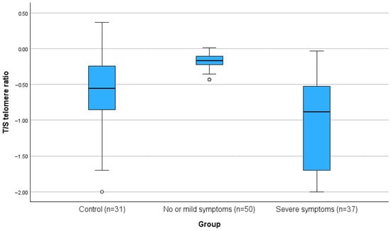 The T/S telomere ratio was significantly lower in people with severe COVID-19 compared to the non-severe group and the control group (all p < 0.001). For the primary outcome of the study, the telomeres, the differences are also presented in Figure 1.
