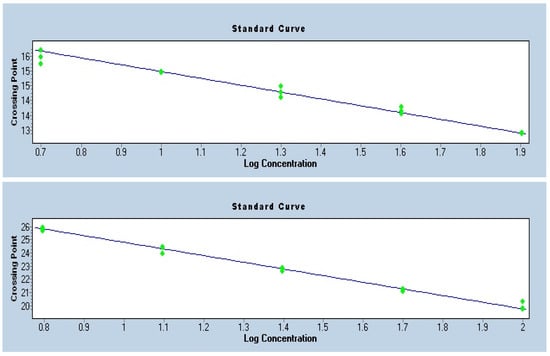 To ensure the accuracy of telomere length quantification by qPCR, standard curves were generated for the telomere repeat assay and for the single-copy reference gene albumin. Both standard curves exhibited strong linearity (R2 > 0.99) and slopes within the acceptable range, corresponding to amplification efficiencies close to 100% (Figure 2). The consistency of the Ct values across serial dilutions confirmed reliable assay performance and absence of major technical artifacts. These quality control measures validated the use of the telomere-to-single-copy gene ratio for the calculation of relative telomere length.