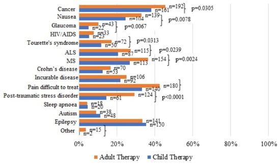 Responses on indications differed between adults and children. Across most conditions, respondents were more likely to endorse use in adults than in children. The largest adult–child gaps concerned post-traumatic stress disorder, pain, nausea, glaucoma, multiple sclerosis, cancers, and Tourette syndrome. Conversely, respondents were relatively more open to paediatric use for autism, epilepsy, and sleep apnoea; however, these differences were not statistically significant (Figure 1).