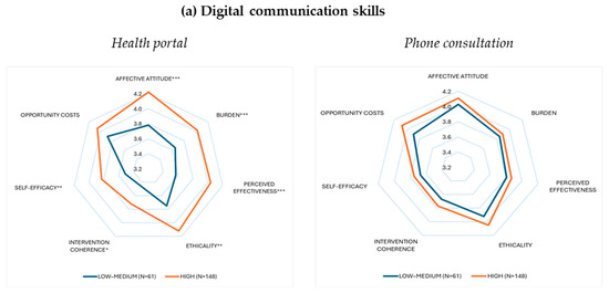 Radar plots showing mean scores across seven acceptability domains of patient portals and phone consultations, stratified by three important participant characteristics: (a) digital communication skills, (b) HRQoL, and (c) attained education level. Each subplot displays two groups with their respective sample sizes (N) in parentheses. Statistically significant group differences are indicated by asterisks as * p < 0.05, ** p < 0.01, and *** p < 0.001.
