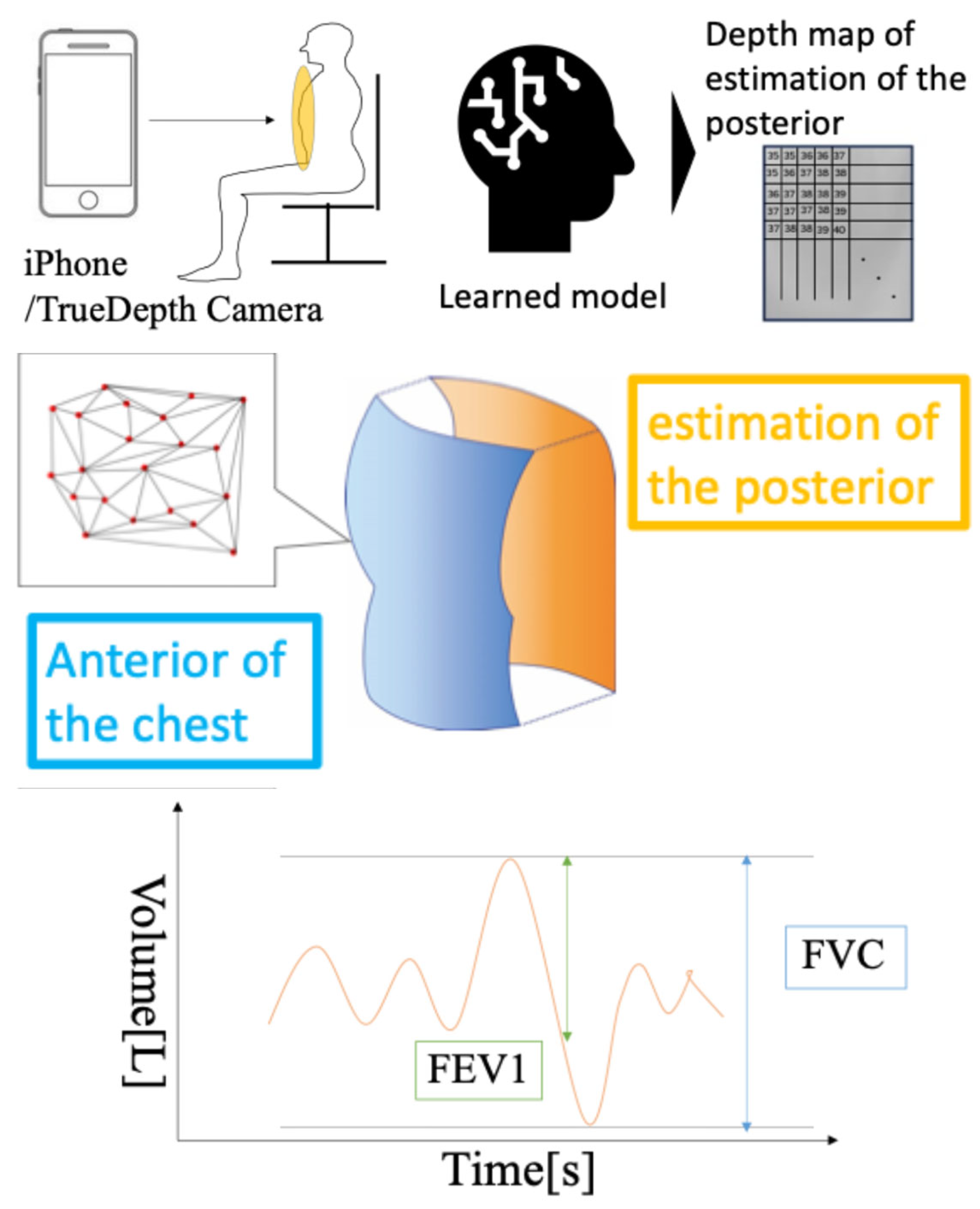 Figure 1. When the TrueDepth camera detected the correct sitting position, DepthRecorder automatically displayed an image of the examinee’s anterior thorax on the screen. Measurements were initiated by pressing the “Start Measurement” button on the app, simultaneously with the start of spirometry. A schematic overview of the measurement process is shown in