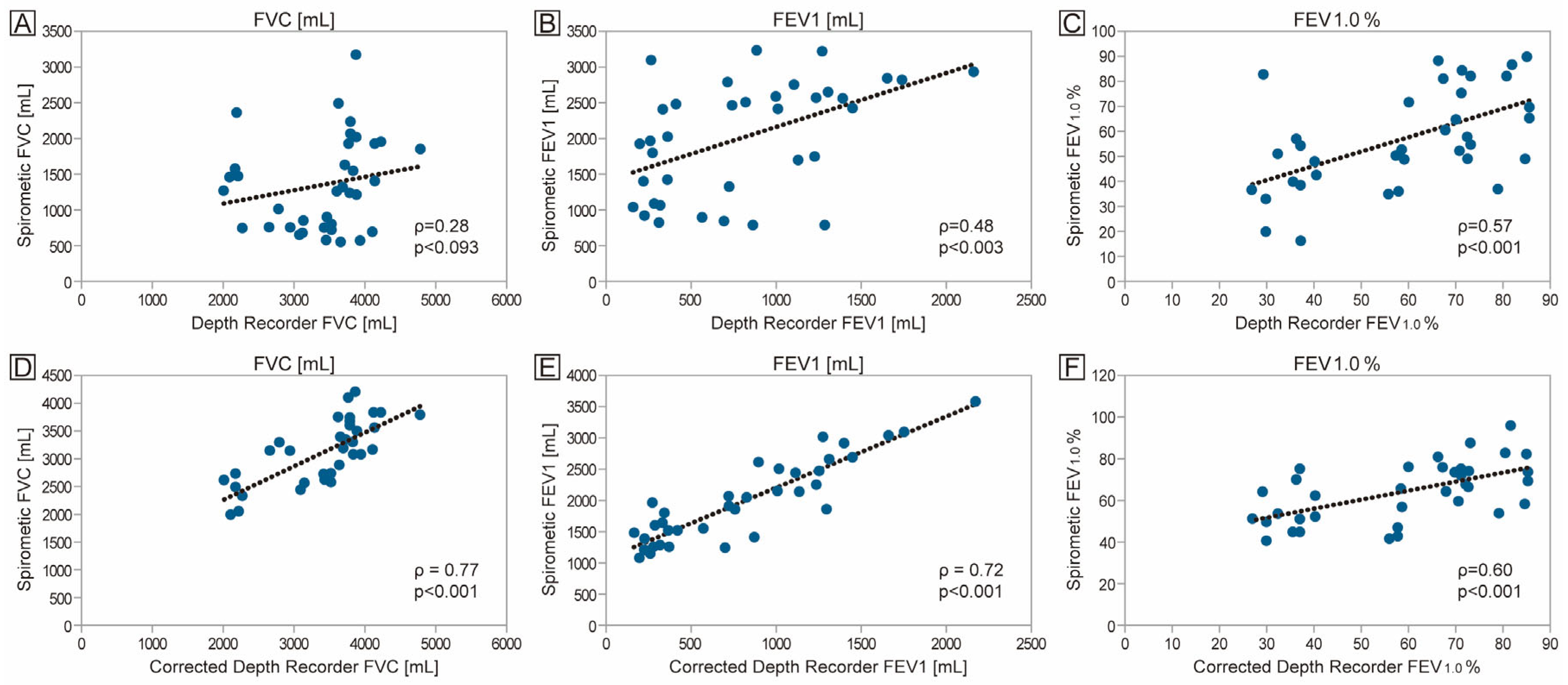 Figure 4D–F. Corrected DepthRecorder FVC (mL) and corrected DepthRecorder FEV