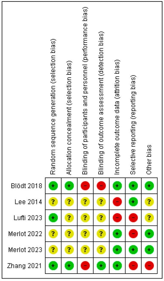 - Higgins, J.P.T.; Altman, D.G.; Gøtzsche, P.C.; Jüni, P.; Moher, D.; Oxman, A.D.; Savović, J.; Schulz, K.F.; Weeks, L.; Sterne, J.A.C.; et al. The Cochrane Collaboration’s tool for assessing risk of bias in randomised trials. BMJ 2011, 343, 5928. [Google Scholar] [CrossRef]