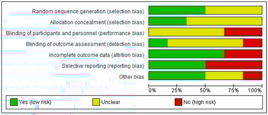 The Cochrane Risk of Bias Assessment Tool [] was used to assess the risk of bias of the articles included in this review. Figure 2 and Figure 3 show the summary and the graph of the risk of bias, respectively. Random sequence generation and allocation concealment were evaluated as low risk in three studies [,,] and in two studies [,], respectively. These two domains were not assessed as having a high risk of bias in any study. Blinding of participants and personnel was evaluated as high risk in two studies [,]. Blinding of outcome measures was assessed as low risk in one study [] and as high risk in one study []. Incomplete outcome data was evaluated as low risk in four studies [,,,] and as high risk in the other two studies [,]. Selective reporting was evaluated as low risk in three studies [,,] and as high risk in the other three studies [,,]. The risk of other bias was assessed as low risk in three studies [,,], as high risk in one study [] and as unclear risk in two studies [,].