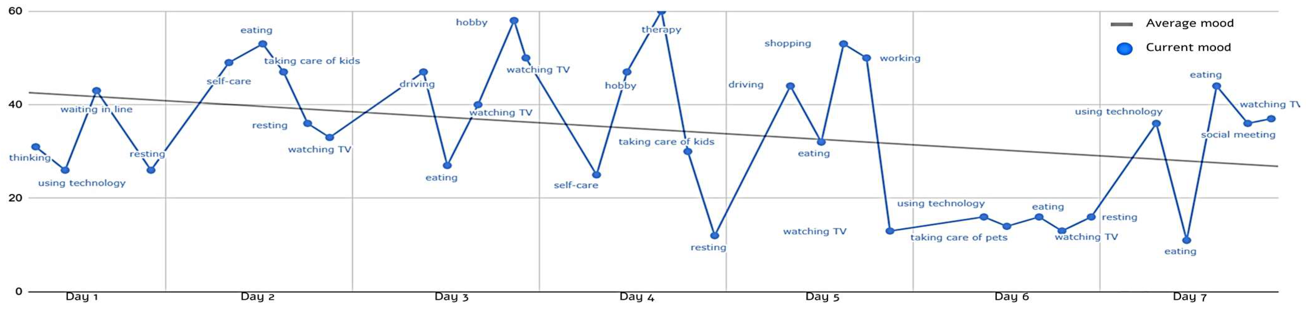 Phase 1 focuses on assessing mood and function (participation and occupational balance) to create a personalized profile and set individual goals. Participants review their mood tracking and occupational balance results, map daily routines, and collaboratively identify functional goals that guide the intervention. This phase introduces core concepts such as occupational balance, mood instability, and mood regulation, emphasizing the reciprocal relationship between mood and daily activities. It combines psychoeducation, personal reflection, and diary use to monitor mood and participation. To illustrate this process, Figure 3 presents an EMA-based graph from a pilot participant’s profile mapping in Phase 1, showing daily mood fluctuations and activity patterns over one week before the intervention. This visual tool helps both participant and occupational therapist recognize personal routines and occupations and set goals for the intervention’s next steps.