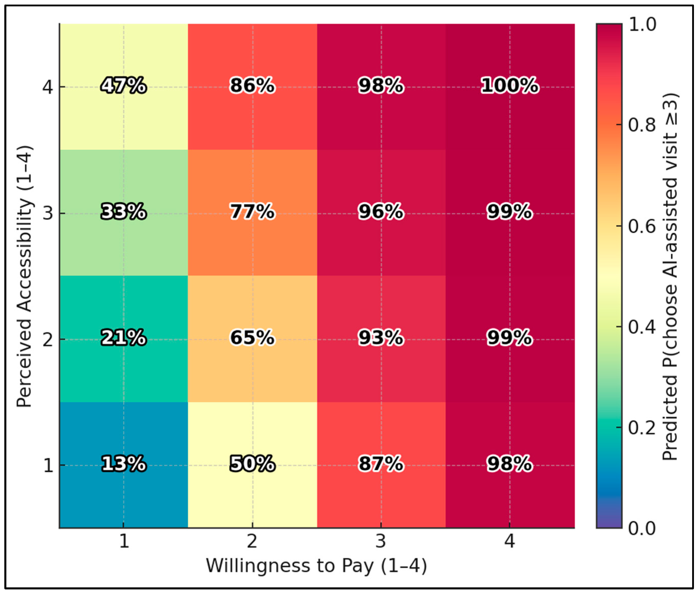 In the proportional-odds model, willingness to pay was strongly associated with choosing an AI-assisted visit (OR 6.81, 95% CI 3.39–13.66;