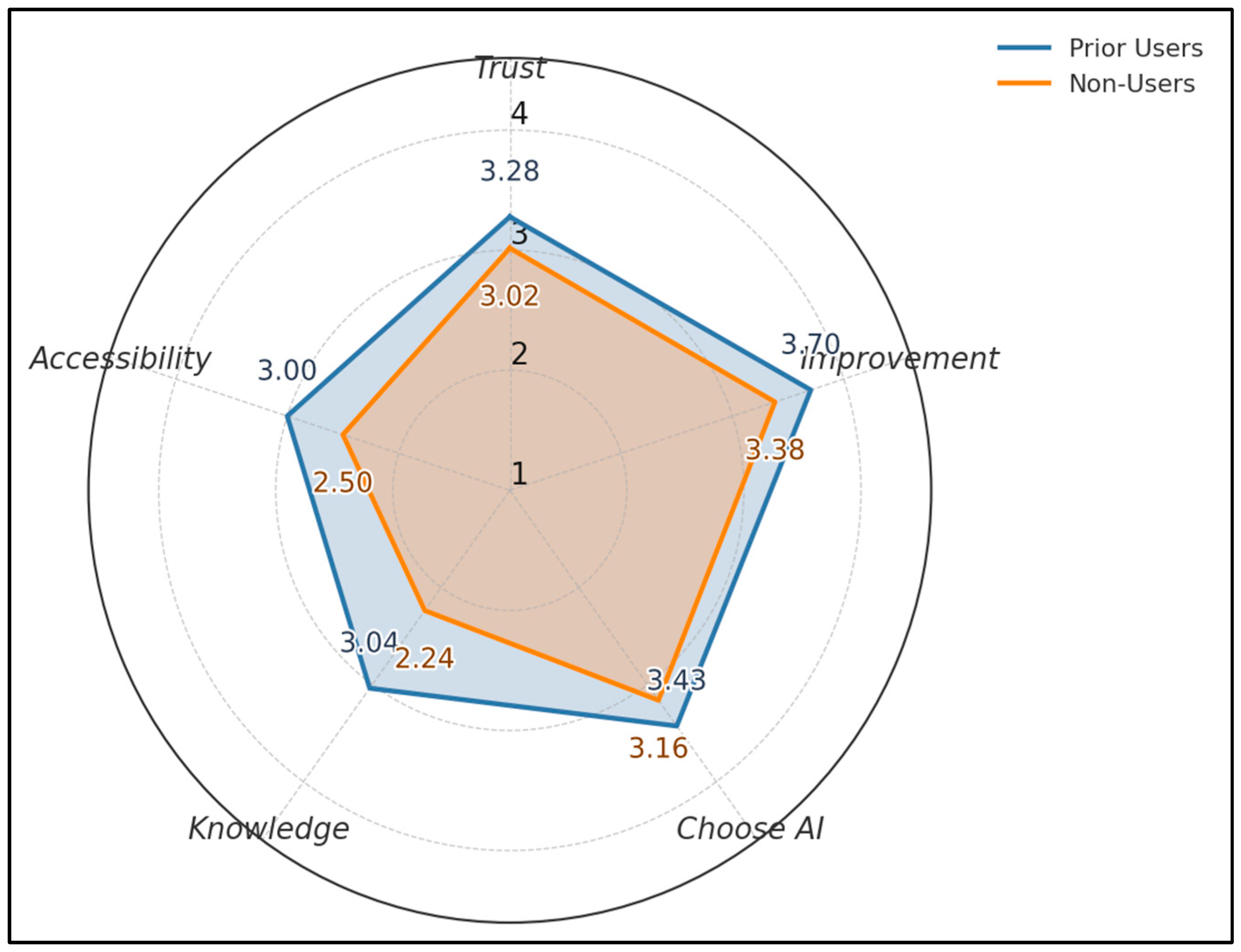 24]. Broader public polling about AI in U.S. healthcare similarly finds cautious optimism, with interest in convenience and perceived effectiveness balanced against misgivings, consistent with our mid-to-upper scale means on trust and perceived improvement [