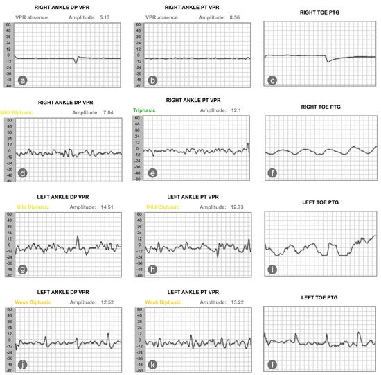 On 1 June 2025, his vascular status and sudomotor reflex response were reassessed. Results showed that the sudomotor reflex response, the nitric oxide peak, and the patient’s ABI slightly worsened. Yet, the perfusion of the right toe improved; the TBI of the right second toe increased from 0.15 to 0.36 (Table 2). We also saw an improvement in the blood volume of the dorsalis pedis and posterior tibialis artery, as recorded by photoplethysmography. The volume plethysmography records (VPR) of the right ankle dorsalis pedis and posterior tibialis arteries were minimal in January 2025. In May 2025, the VPR of the right dorsalis pedis and posterior tibialis arteries improved, becoming mildly biphasic and triphasic, respectively. The TBI of the left foot, in contrast, decreased from 0.58 to 0.31, with the VPR of the left dorsalis pedis and posterior tibialis artery worsened from mildly biphasic to weakly biphasic (Figure 2).