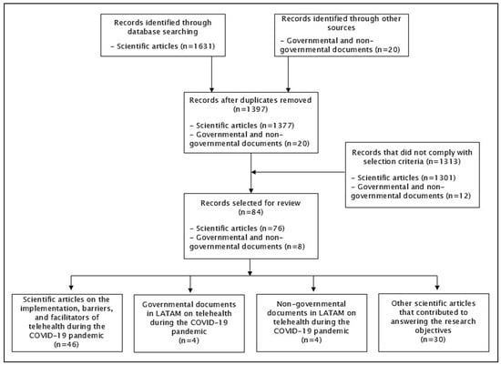Initially, 1631 scientific articles and 20 governmental and non-governmental documents were identified for the literature review. A total of 254 duplicates were found and removed. After applying the inclusion and exclusion criteria, 84 documents were selected for the literature review (76 scientific articles, 4 governmental documents, and 4 non-governmental documents). Figure 1 presents a flowchart of the article selection process for the literature review.