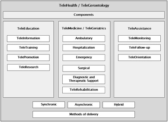 Figure 2. Components of telehealth, their relationship with the branches of telemedicine and telerehabilitation, and their modalities of delivery; with emphasis on the care of older persons, incorporating the concepts of TeleGerontology and TeleGeriatrics. Own elaboration based on the document “National Telehealth Program in the context of Integrated Health Services Networks” [19].