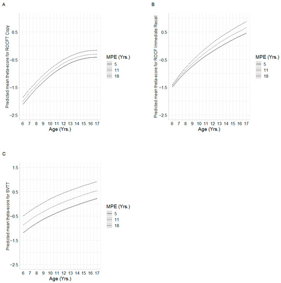 Mean predicted ability scores for each regression model. Subfigures (A–C) show the interactions between age and MPE for (A) = ROCF Copy, (B) = ROCF Immediate recall, and (C) = SVTT.