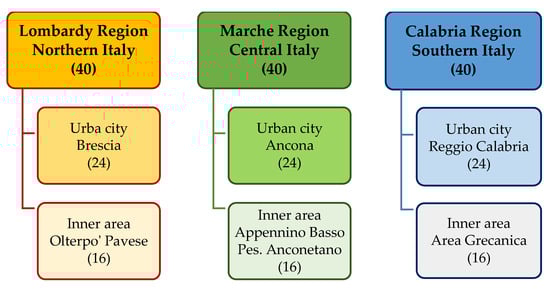 In each region, 40 older people were recruited (for a total of 120 individuals—90 women and 30 men; the recruitment process is better described in Section 2.2 below) from one medium-sized urban city with about 100,000–200,000 residents (respectively, Brescia, Ancona, and Reggio Calabria) and one rural/inner area (respectively, Oltrepò Pavese, Appennino Basso Pesarese e Anconetano, and Area Grecanica) (Figure 1).