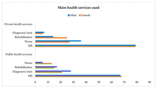 When moving from the general use of public vs. private healthcare to single types of services in each sector, the gender dimension takes on more nuances/declinations, as a result of more types being reported by each respondent in some cases. With respect to public health services, senior people reported more than one in some cases; in particular, MSs (68% in total, and similar for both genders) and diagnostic tests (23% in total, more for men), followed by rehabilitation (15% in total, slightly more for men) and nursing care (the latter reported predominantly by women). Some health services are, however, more requested from the private sector, especially MSs (79%, both genders), nursing care (29%, more for men), and rehabilitation (23%, more for women) (Table 5; Figure 3).