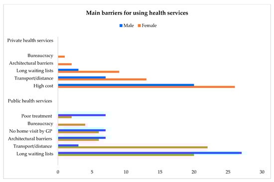 The greatest barriers to using public health services are the long waiting lists (22%) and the need for accompaniment/transport to reach a necessary destination, which is often very distant from an individual’s home (18%). These two barriers are more commonly reported on by men (27%) and by women (22%), respectively. Other obstacles reported by both genders are architectural barriers and a lack of availability to provide home visits by GP. Bureaucracy was complained about only by women, and poor treatment was brought up by men especially. In the private health sector, major barriers are the cost of services (24%, more for women), the need for accompaniment/transport, and, in some cases, long waiting lists (12% and 8%, respectively, more for women) (Table 6; Figure 4).