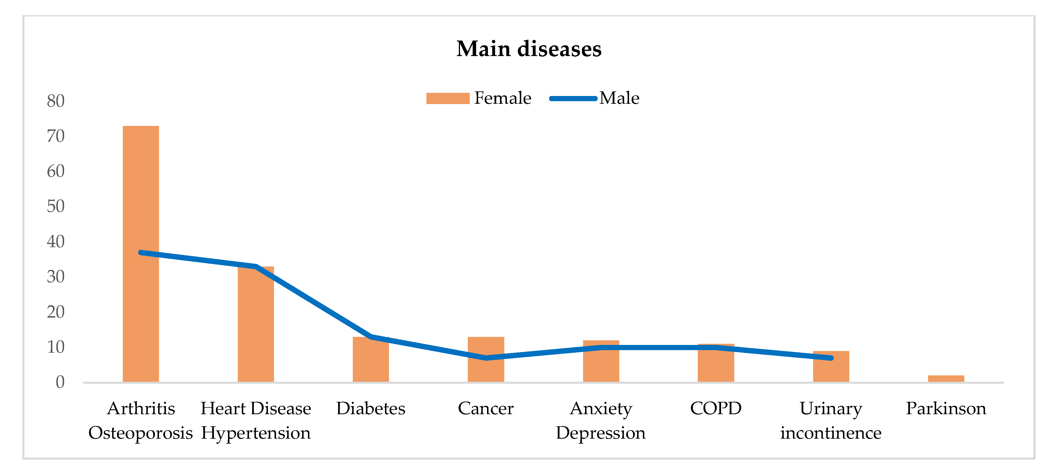 | Health | Diseases | Arthritis/osteoporosis; heart disease/hypertension; diabetes; asthma/chronic obstructive pulmonary disease (COPD); cancer; Parkinson’s; anxiety/depression; urinary incontinence Gender: female, male |