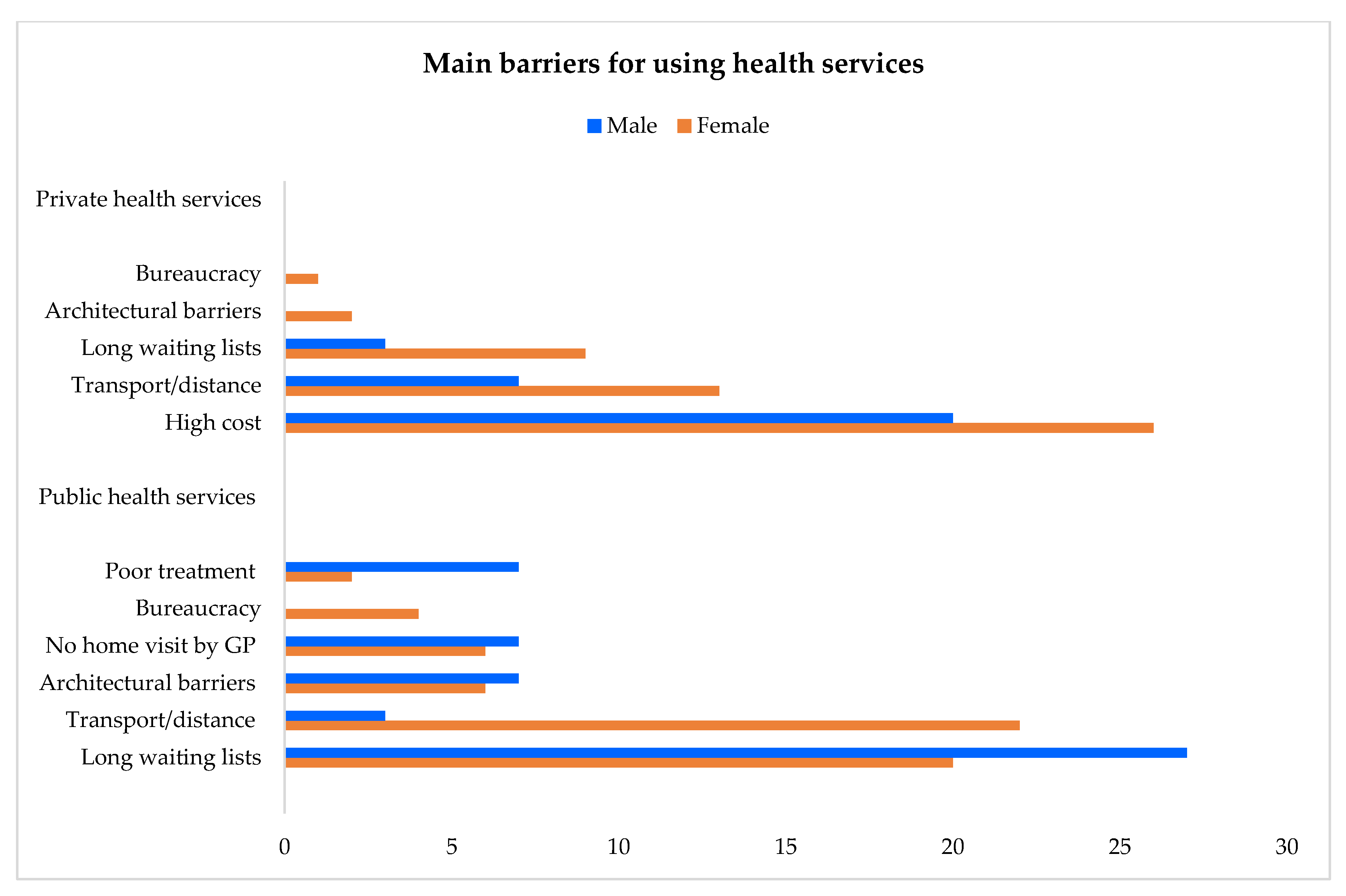 | Barriers for using services | Public health services | Long waiting lists; transport/distance; architectural barriers; bureaucracy; poor treatment; no home visits by GP Gender: female, male |