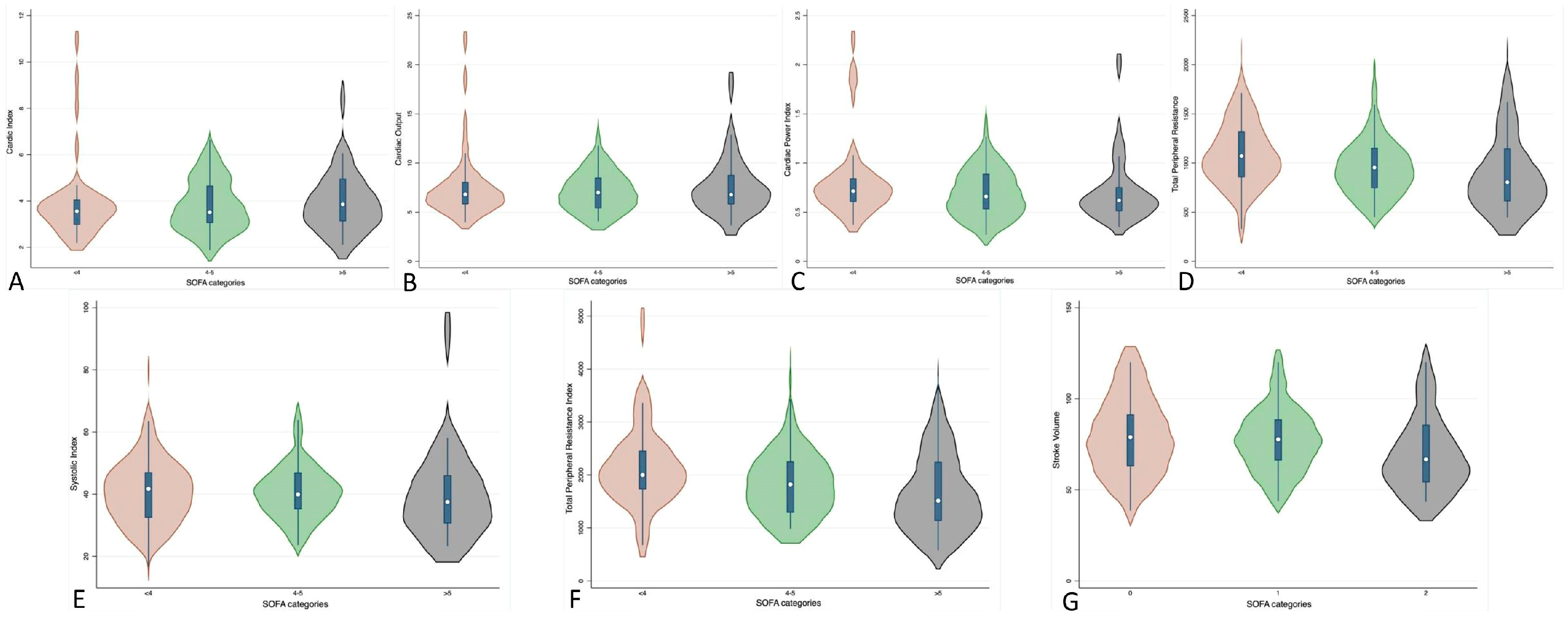 Figure 1) further demonstrate the within-tertile heterogeneity: each parameter (SV, SI, CO, CI, CPI, TPR, TPRI) shows wide, largely overlapping distributions across SOFA categories, and aside from the trend toward lower TPR/TPRI, no clear monotonic progression emerges.
