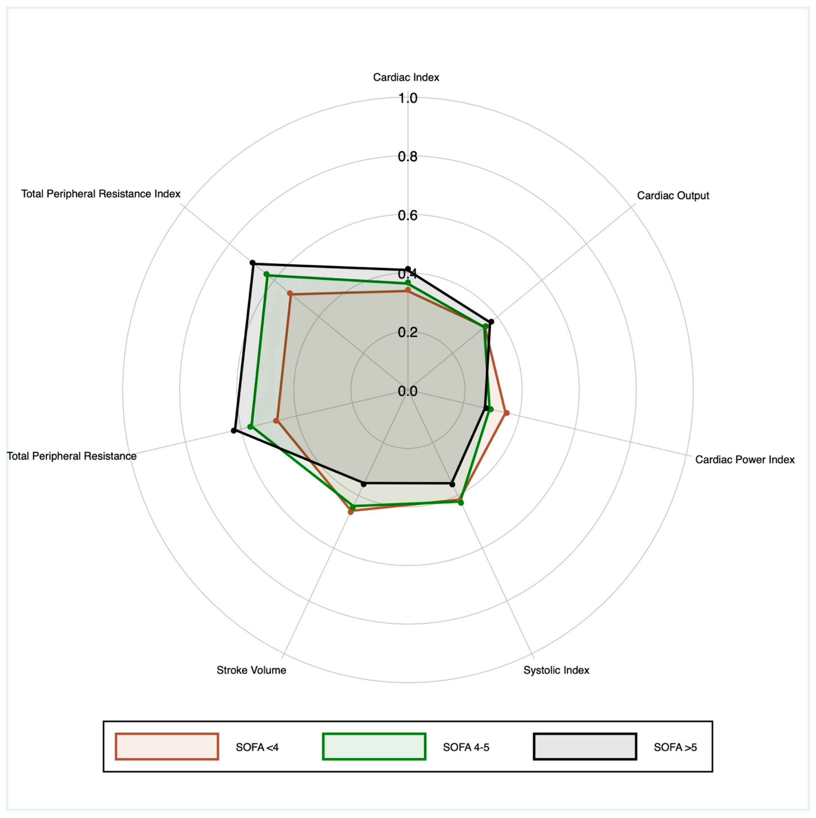 3]. Because the SOFA score summarizes multi-organ dysfunction and does not directly capture macro-hemodynamic status, we investigated whether noninvasive cardiovascular indices can reveal circulatory heterogeneity among patients with similar SOFA levels, thereby complementing SOFA in characterizing perfusion phenotypes.