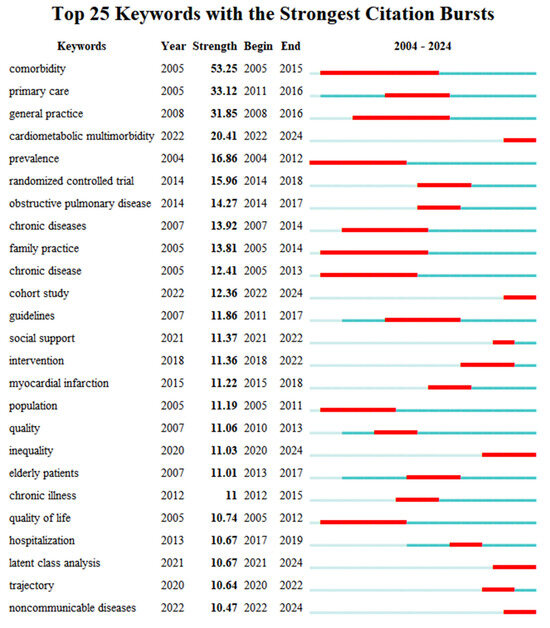 Emerging directions in multimorbidity research can be identified by tracking sharp increases or notable shifts in keyword frequencies across different time periods. These terms, referred to as “burst terms”, are determined based on the rate of frequency growth in titles, abstracts, and keywords. The burst strength quantifies the intensity of focus on a given topic [17]. Using the burst detection function in CiteSpace software, prominent burst terms were extracted (Figure 3). Excluding the search term itself, “primary care” and “general practice” recorded the highest values, highlighting the field’s strong focus on disease care. From a demographic perspective, “elderly patient” (11.01) highlighted the ongoing emphasis on older adults within multimorbidity research. Analysis of recent burst terms revealed rising interest in “cardiometabolic multimorbidity” (20.41), suggesting this may become a key direction moving forward. The emergence of “inequality” (11.03) pointed to an increasing focus on social determinants, indicating that health inequality is gaining prominence as a research frontier. In addition, “cohort study” (12.36) and “latent class analysis” (10.67) indicated the frequent adoption of these study designs and analytical methods in recent investigations.
