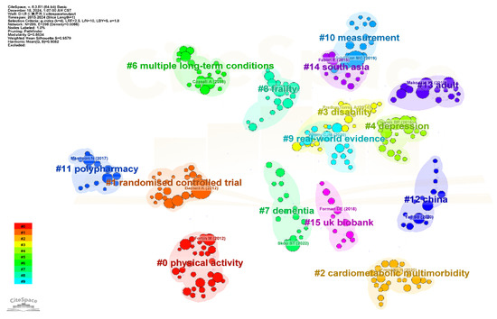 To identify recent trends and thematic directions over the past decade, we carried out a co-citation analysis of multimorbidity publications from 2015 to 2024. Clustering was performed using keywords and the LLR algorithm, producing 16 clusters (Figure 5). The modularity score (Q = 0.86) and silhouette score (S = 0.96) indicated strong structural consistency in the clustering. Detailed characteristics of each cluster are summarized in Supplementary Materials Table S3.