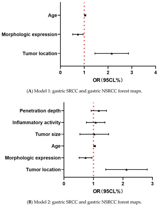 The contents of the forest maps of the gastric SRCC and gastric NSRCC groups include age, tumor site, and morphological manifestations (A), plus tumor size, inflammatory activity grade, and depth of invasion (B), plus the Kimura–Takemoto classification and enterochemical-grade gender (C).