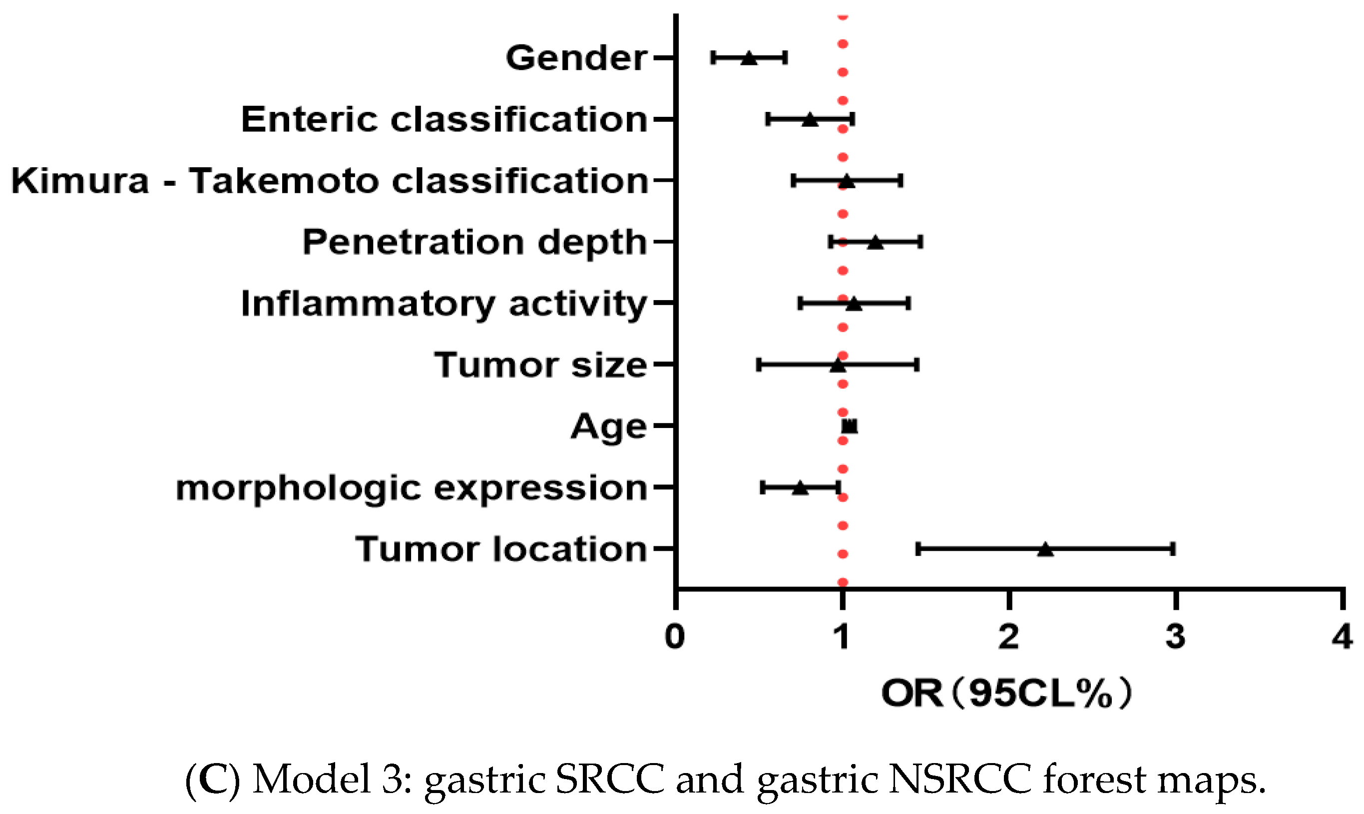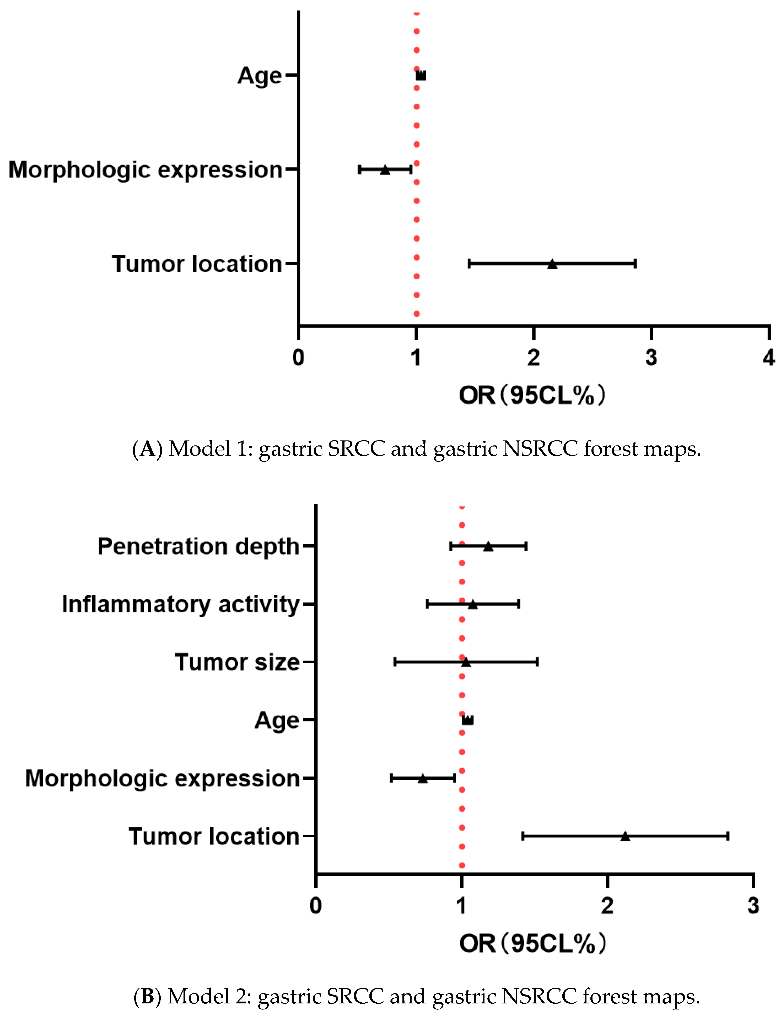 3.2. Univariate and Multifactorial Results Obtained for Both Gastric SRCC and Gastric NSRCC