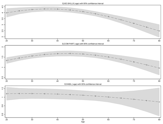 In this section, we present results based on the trivariate regression model with full Sarmanov–Lee dependence structure; this is the model denoted Trivariate Model 2 in Table 2. First, we discuss the age utilization gradient and marginal effects at the mean for prosthetics, assistive technologies, working status, and type of living arrangements. Then, results are presented for the supports intensity need utilization gradient and marginal effects of levels of intellectual functioning, exceptional behavioural and medical support needs, and expressed desires of the clients and their families.