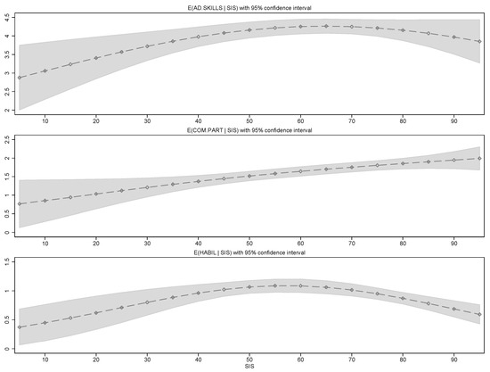 Computing Kendall’s τ statistics to evaluate the degree of dependence between the key count variables yielded all positive and statistically significant results, i.e., τ(AD. SKILLS, COM. PART) = 0.1154, z = 6.30, τ(AD. SKILLS, HABIL) = 0.1430, z = 7.74, τ(COM. PART, HABIL) = 0.0676, z = 3.72. We computed standard errors for z statistics with somersd Stata 16 package. The association was strongest between AD.SKILLS and HABIL, while COM.PART and HABIL showed the weakest degree of association. These results suggested that AD.SKILLS, COM.PART, and HABIL supports are considered functional complements in the socio-ecological logic of person-centred case management. Nonetheless, the detected bivariate associations in our sample are merely unconditional in nature and, for instance, cannot control for observed heterogeneity.