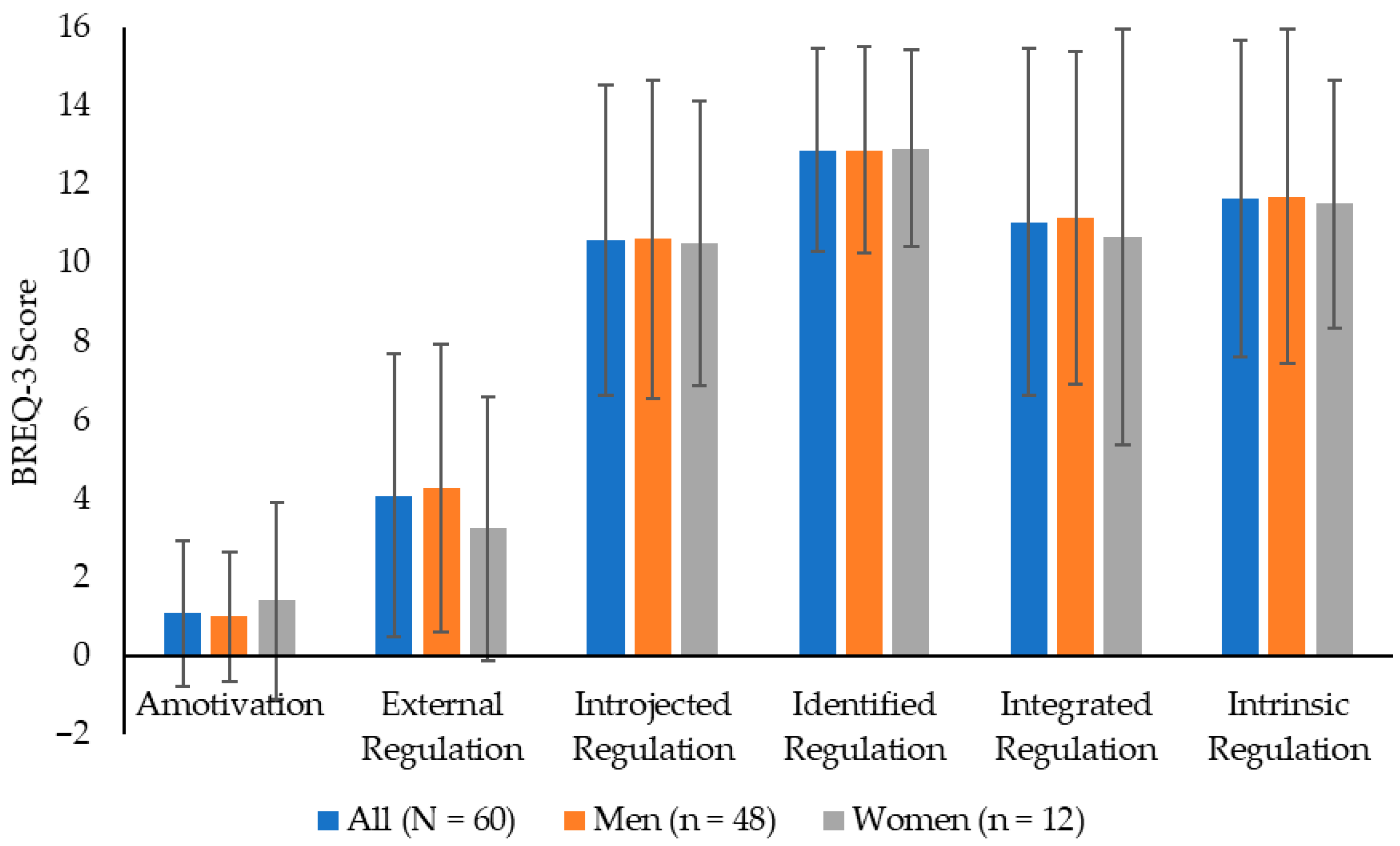 2.4. Behavioral Regulation in Exercise Questionnaire (BREQ-3)—Motivation Questionnaire