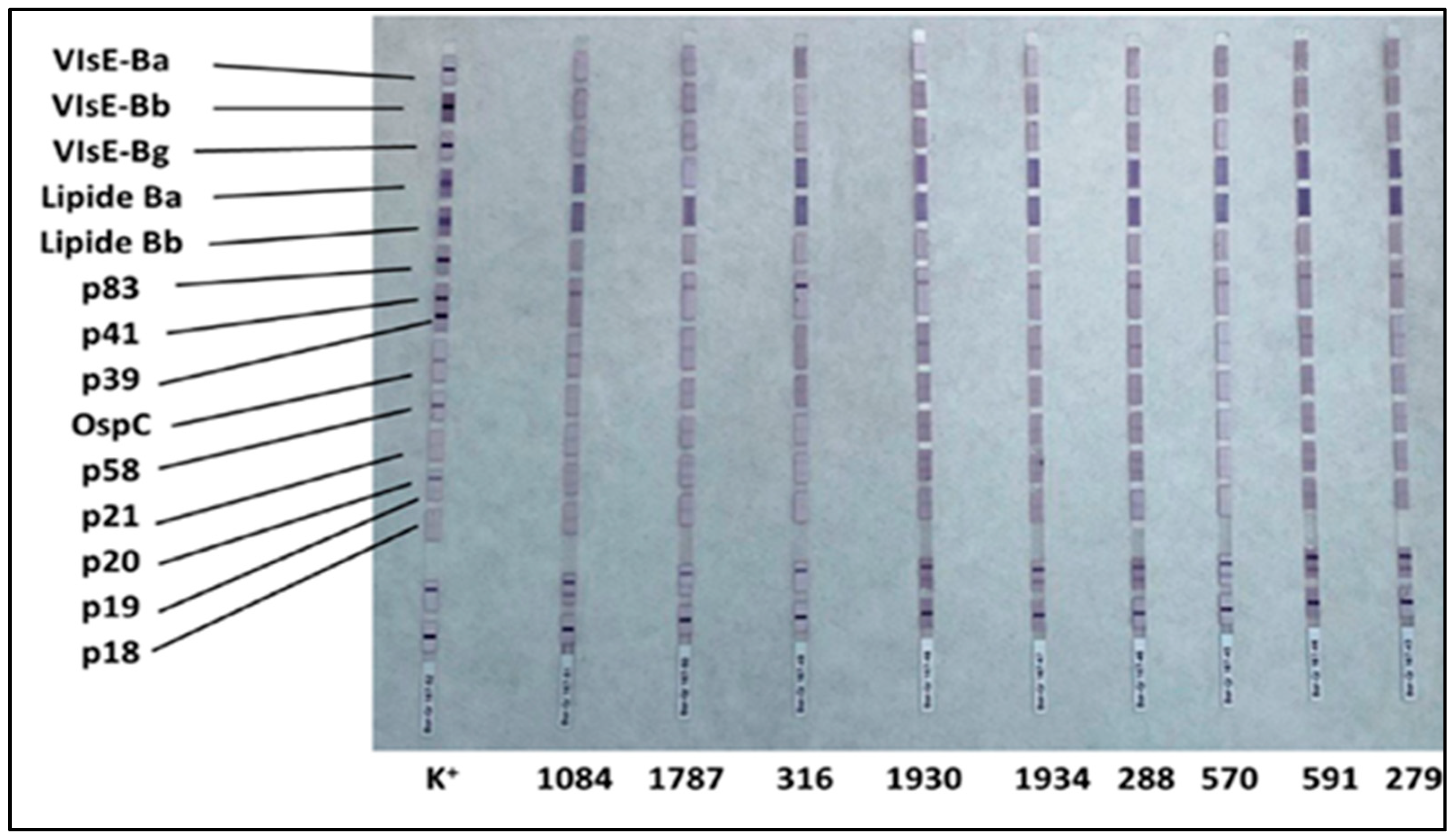 | ID | VIsE Ba | VIsE Bb | VIsE Bg | Lipide Ba | Lipide Bb | p83 | p41 | p39 | OspC | p58 | p21 | p20 | p19 | p18 |