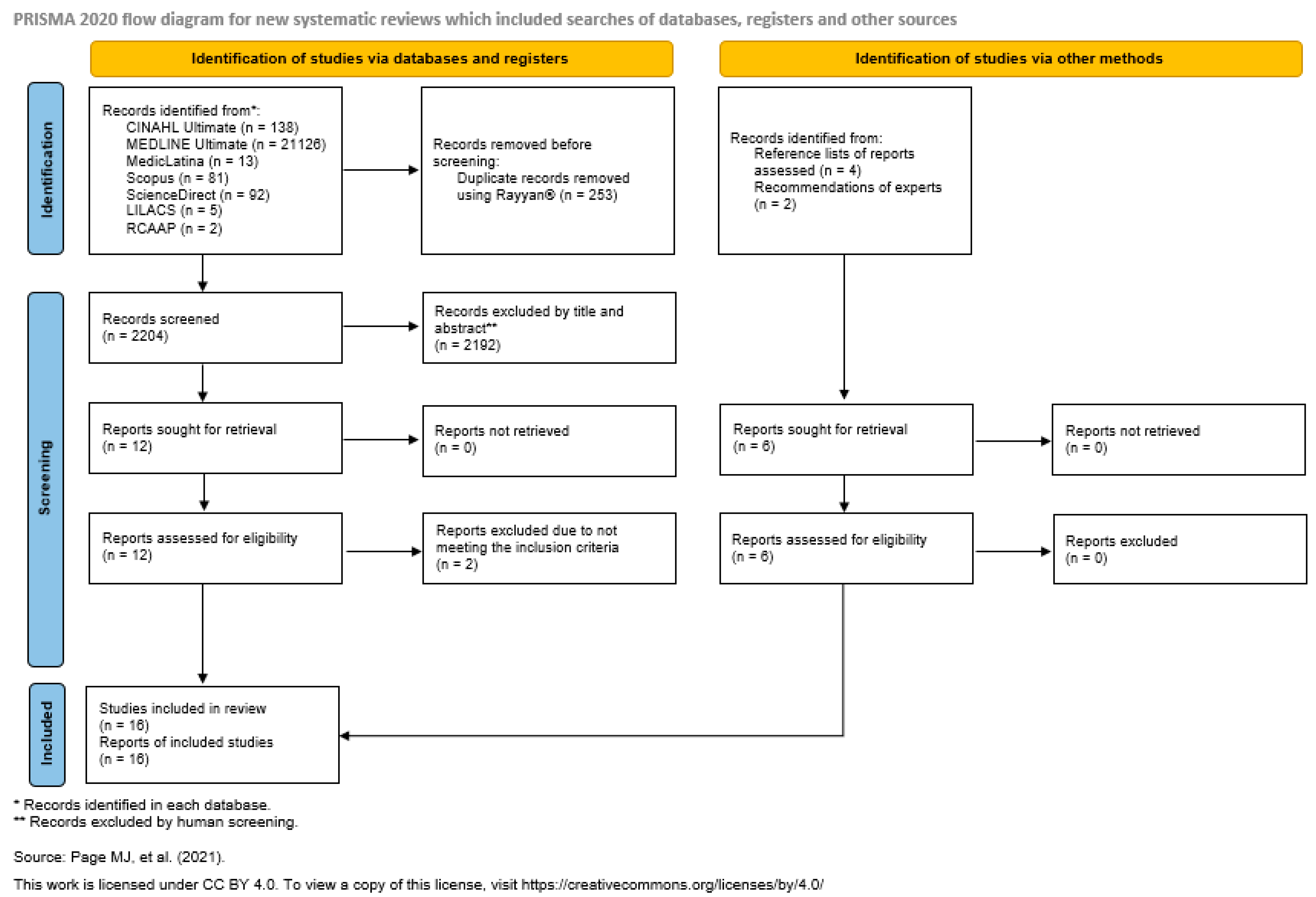 At the end of the process, 16 studies were considered eligible and included in this review. Figure 1 shows the results of the article analysis stages, according to the PRISMA Flow Diagram [33].