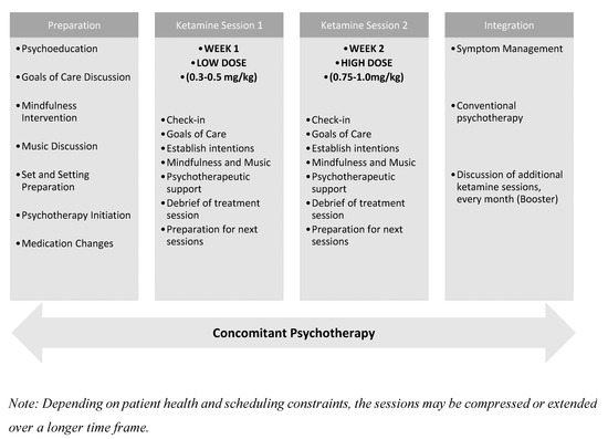 - Garel, N.; Drury, J.; Thibault Lévesque, J.; Goyette, N.; Lehmann, A.; Looper, K.; Erritzoe, D.; Dames, S.; Turecki, G.; Rej, S. The Montreal model: An integrative biomedical-psychedelic approach to ketamine for severe treatment-resistant depression. Front. Psychiatry 2023, 14, 1268832. [Google Scholar] [CrossRef]