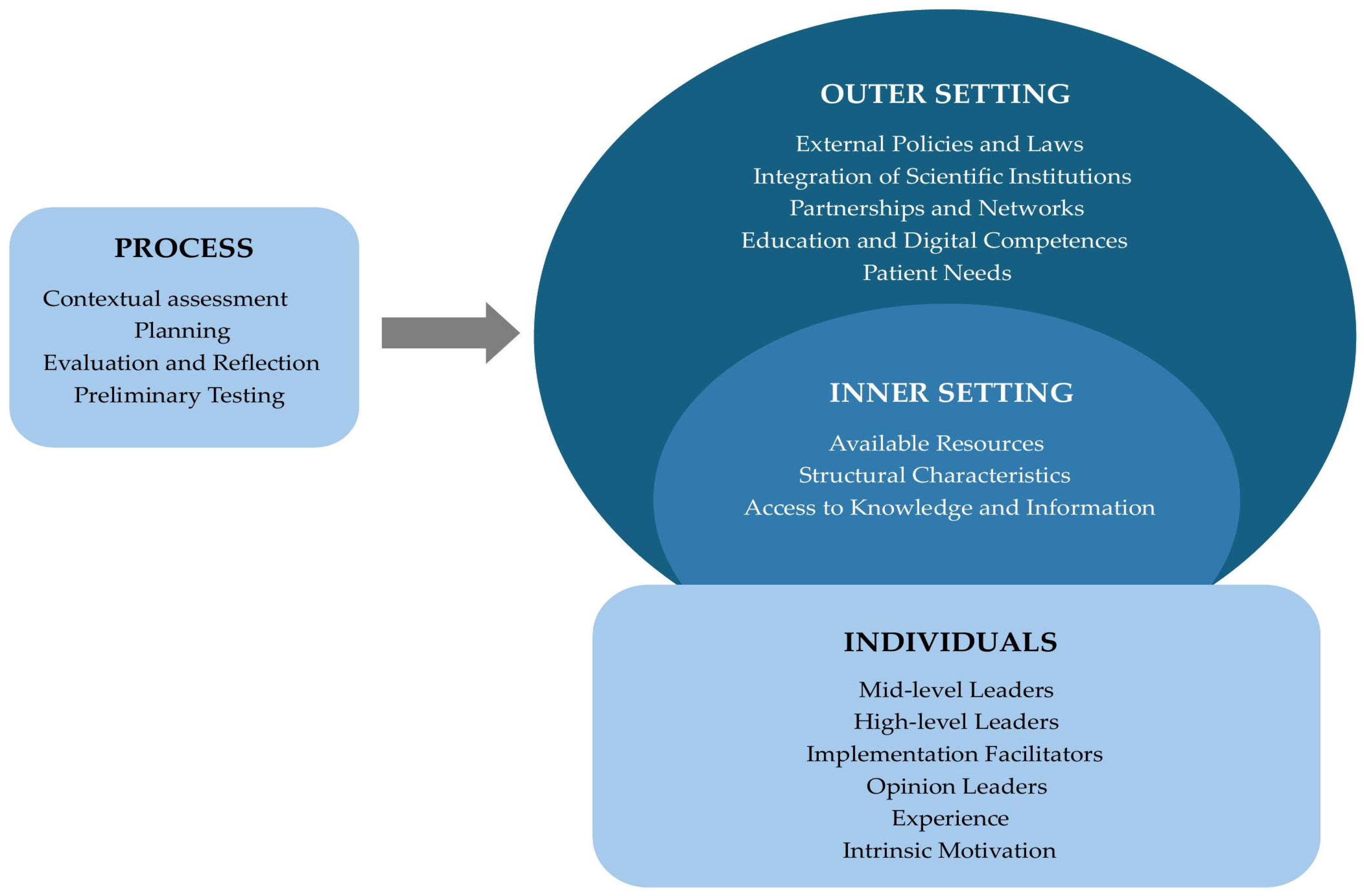 It should be noted that the resulting representation reflects a modified version of the CFIR. In contrast to the original CFIR, which consists of five domains, this adapted version includes four domains—Outer Setting, Inner Setting, Process, and Characteristics of Individuals—while the Intervention domain was excluded. This adaptation reflects the study’s specific focus on organizational, external and contextual factors influencing the implementation of DHIs for depression care.