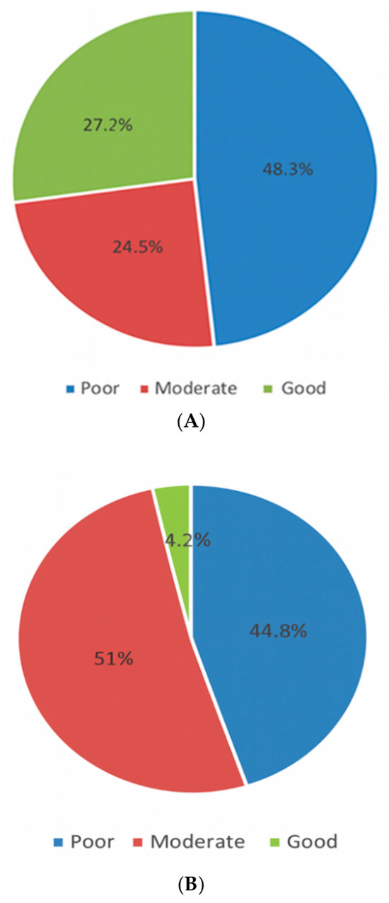 Regarding the assessment of the knowledge about AH and gout (Table 2), nearly half (48.9%) knew that the correct threshold for serum uric acid levels defining AH was >7 mg/dL in males and >6 mg/dL in females, and 54.7% knew that AH does not always progresses to gouty arthritis, whereas 55.2% were aware that AH does not always require treatment. Based on the knowledge categories mentioned above in the questionnaire criteria and statistical analysis, the total mean knowledge score was 1.59 (SD 1.09), and the median was 1.0 and the IQR was 1, with poor, moderate, and good knowledge constituting 48.3%, 24.5%, and 27.2%, respectively (see also Figure 1A). Regarding the practice, 50.3% knew the most appropriate method to perform during the initial evaluation of a patient with a suspected gouty attack.