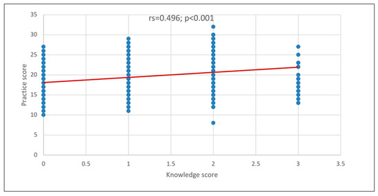 Figure 2 illustrates a significant positive correlation between knowledge and practice scores (rs = 0.496; p < 0.001), indicating that an increase in knowledge score is associated with a corresponding increase in practice score.