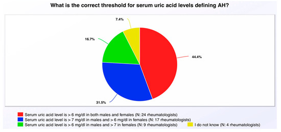 This is understandable because there are different guidelines under which the answers would be correct. The 2012 American College of Rheumatology guidelines defined hyperuricemia as SU greater than either 6.8 or 7.0 mg/dL for both genders [22]. The 2020 American College of Rheumatology guidelines defined AH as 6.8 mg/dL for both genders [12]. Other studies, such as Bardin et al. [3] suggest the definition of AH to be SU greater than 6 mg/dL for both genders, reflecting the correct answers of the 24 rheumatologists. Therefore, these differences in the guidelines and studies defining AH might have affected the responses and the correct answer. Also, the reason why the 24 rheumatologists in our survey chose this answer may have been that the 2020 American College of Rheumatology guidelines recommend achieving and maintaining an SU target of <6 mg/dL for both male and female patients [12].