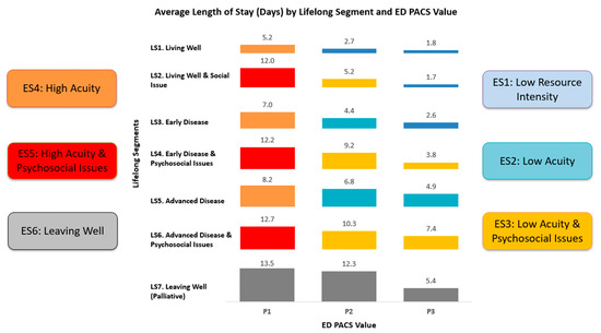 Whilst lifelong care segments represent the ongoing, base needs of a resident living in the community, when crisis and complex care needs occur, there is an escalation of care needs. Under the UCM, this is termed episodic care needs and leads to, e.g., urgent acute hospital admissions. Therefore, the ES model was developed as a systemic extension of the LS model specifically for residents admitted to YH through the emergency department. This model incorporates different levels of episodic care needs, as quantified by the Patient Acuity Category Scale (PACS) value. By layering acute care needs over the existing LS model, the ES model provides a more comprehensive yet systemic view of differing patient person-centred needs during their acute episodes, facilitating vertically integrated and more systemic care delivery for the whole health system. With reference to average length of stay (ALOS) as the key outcome, six ES segments were derived based on Lifelong Segment and ED PACS Value, namely, ES1. Low Resource Intensity, ES2. Low Acuity, ES3. Low Acuity with Psychosocial Issues, ES4. High Acuity, ES5. High Acuity with Psychosocial Issues, and ES6. Leaving Well (Figure 1).