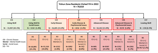 To facilitate the design of more targeted, sub-segment-specific services, for segments with more intense needs, the NBSS model further stratifies residents with chronic diseases (LS3–LS6) into ten sub-segments based on disease complexity and psychosocial needs. The NBSS model creates a matrix structure with two main dimensions: disease stage (early versus advanced) and complexity level. Sub-segments range from residents with single chronic diseases only (A1, B1) to those with multiple chronic diseases combined with both mental health issues and social problems (A5, B5). The intermediate categories capture residents with multiple chronic diseases alone (A2, B2), multiple chronic diseases with mental health issues (A3, B3), and multiple chronic diseases with social issues (A4, B4). This granular sub-segmentation aims to enable the development of horizontally integrated services models that facilitated more targeted care planning for residents with differing levels of medical and psychosocial complexity within the broader chronic disease population. (Detailed segmentation criteria are provided in Appendix B.)