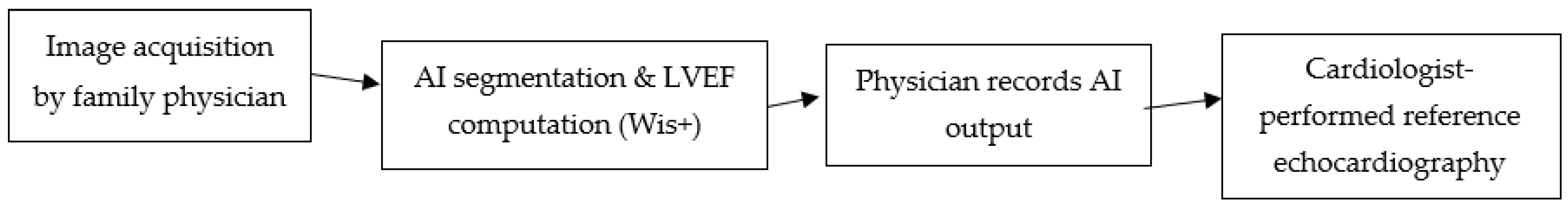 AI integration and outputs: Cine loops from standard views were automatically forwarded to the Wis+ module, which applies a convolutional neural network for endocardial border segmentation and computes LVEF (Simpson’s biplane). When LVEF was <50%, the system flagged an abnormal result. The module also provided speckle-tracking-based wall-motion support and Doppler-aided valvular screening. The family physician reviewed and recorded the AI output but did not alter it. The authors did not modify or retrain the proprietary model. See