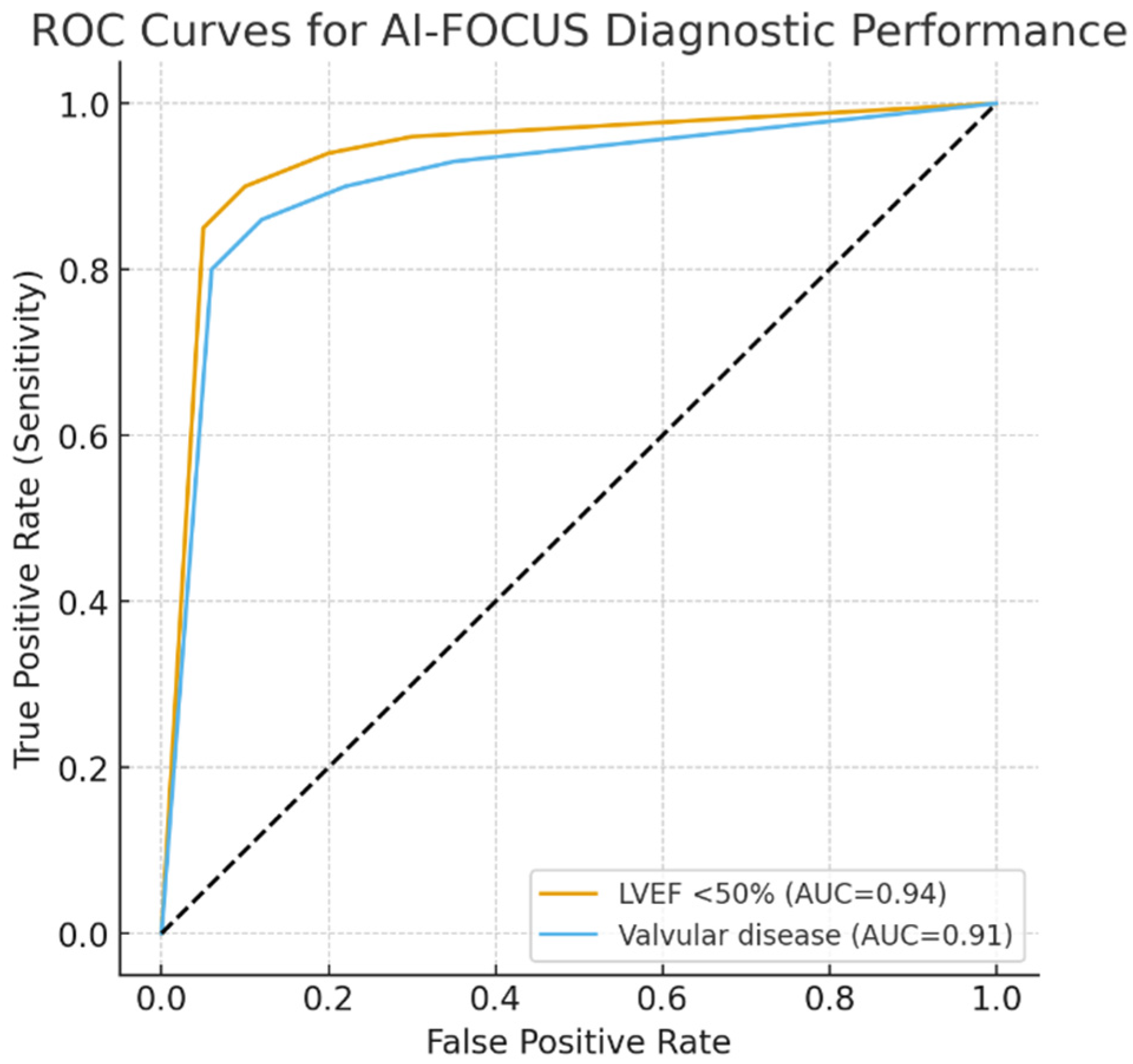 The integration of AI into FOCUS protocols is of paramount importance because it allows general practitioners (GPs) to standardize echocardiographic cardiac measurements, especially left ventricular ejection fraction (LVEF) and valvular assessments, therefore ruling out operator dependency. Our statistics have shown that an AI-assisted LVEF < 50% emerged as the strongest independent predictor of pathology (OR = 6.05), findings which align with emerging evidence from other clinical environments. A multicenter prospective study by LoPresti et al. [