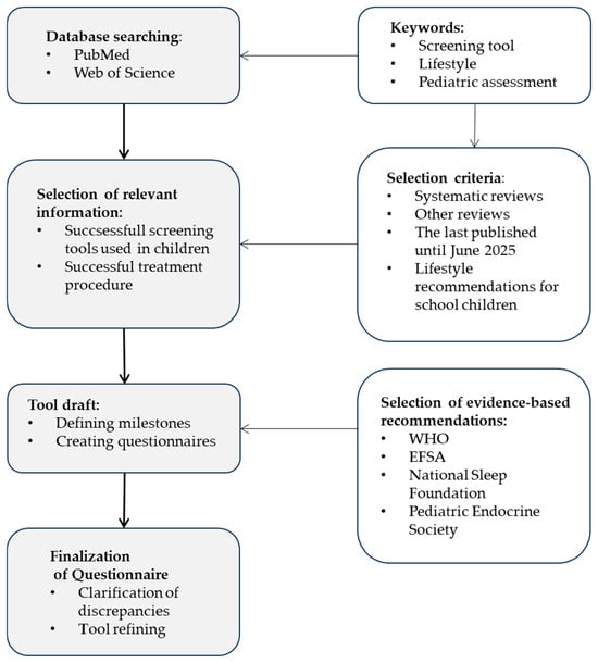 A literature review was conducted to identify and select core information for evaluation. To determine the content of the screening tool, studies and reviews involving children that employed various methods for assessing health risks as part of preventive strategies (including overweight and obesity) were reviewed (Figure 1).