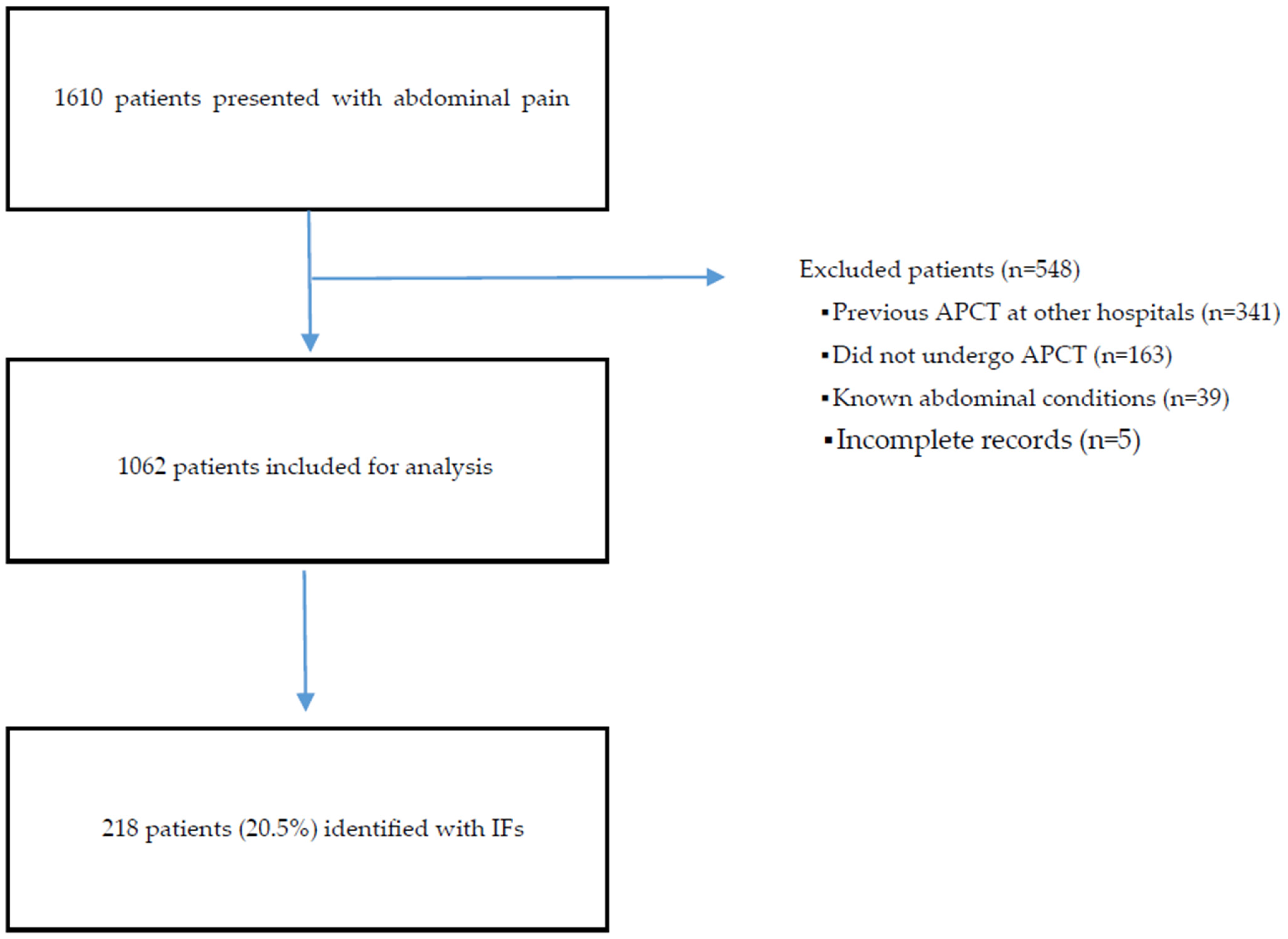 Incidental findings (IFs) were defined a priori as any radiologic abnormality on APCT that was unrelated to the presenting abdominal symptoms or the initial clinical diagnosis, regardless of clinical relevance.