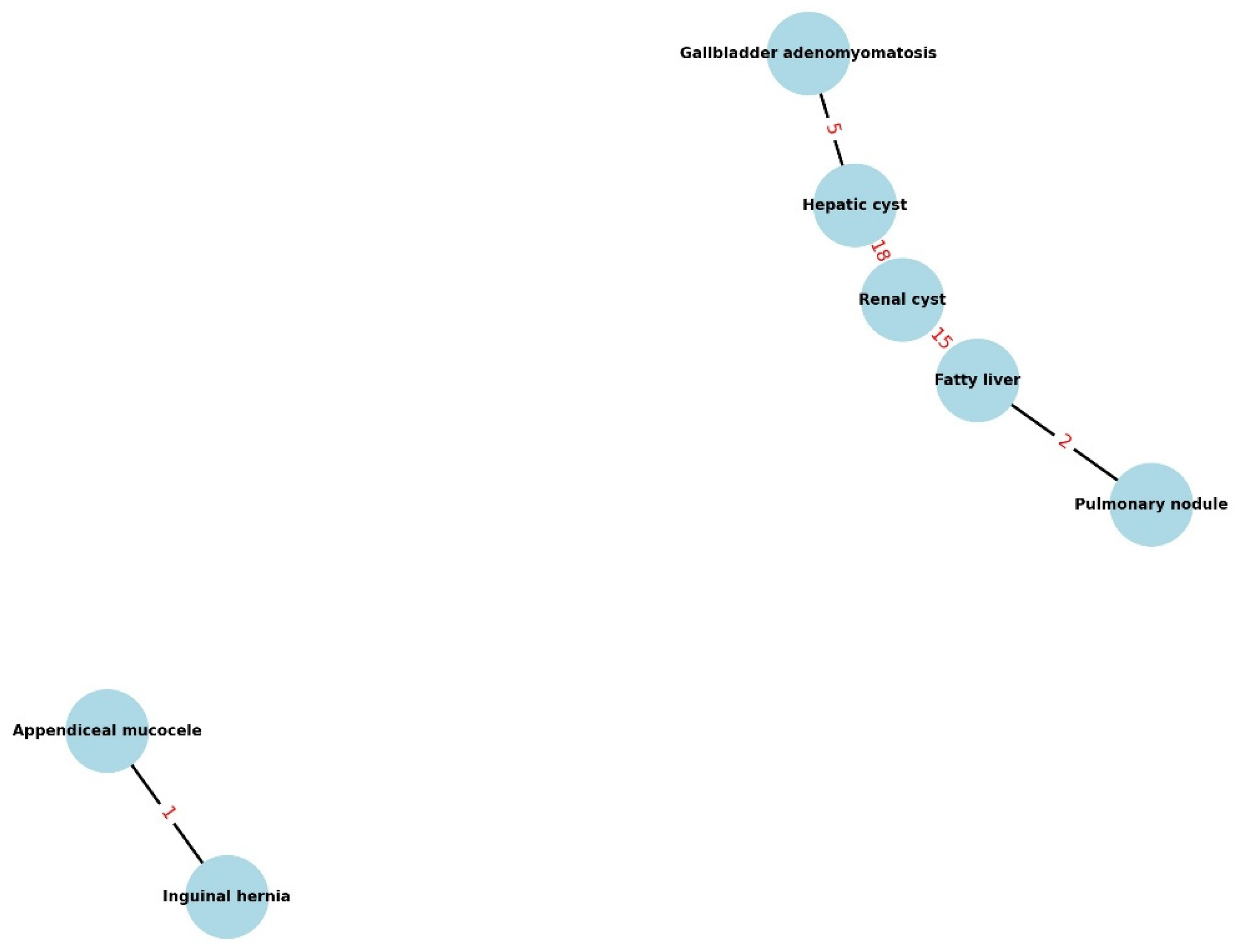 Co-occurrence patterns among IF categories are visualized in a heatmap (Figure 2). The diagonal shows counts for each single IF, and off-diagonal cells show pairwise co-occurrence within the same APCT; zeros indicate no observed co-occurrence. Renal cysts most often co-occurred with hepatic cysts and fatty liver, whereas overlaps involving pulmonary nodules were infrequent. This display is descriptive and should be interpreted with caution for very small cells (e.g., n < 5).
