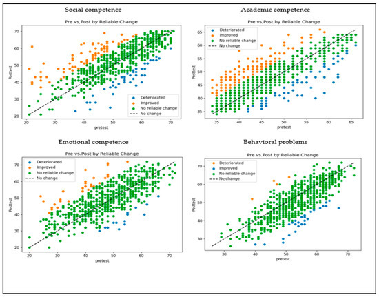 Pretest-posttest relationship for each student and classification of change according to the Reliable Change Index across dimensions. Note. Green indicates the absence of reliable change (stability), orange represents reliable improvement, and blue denotes reliable deterioration. The diagonal line represents the point of zero change.