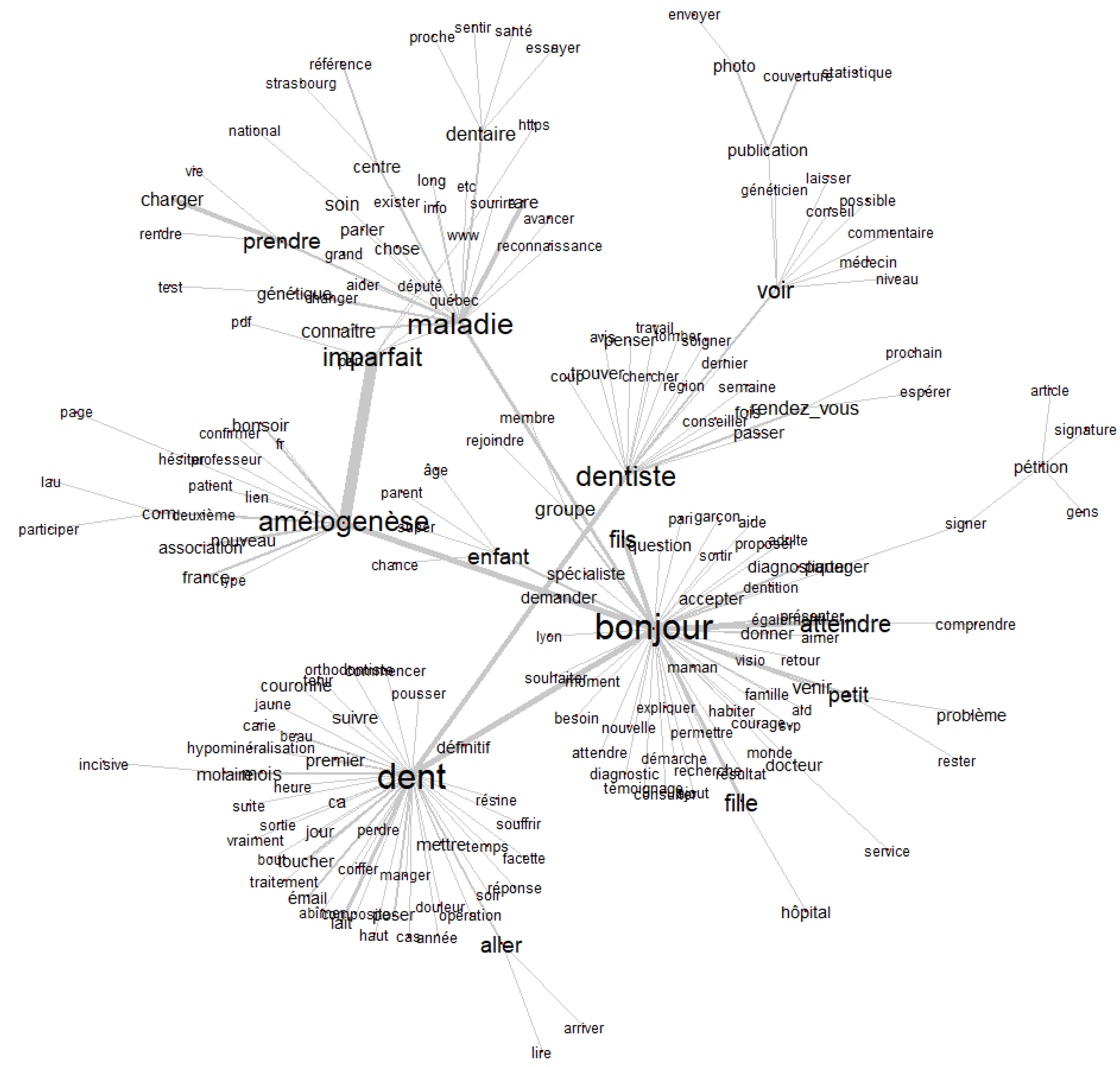 - Finally, the word “amélogenèse” (amelogenesis) appears in direct connection with “imparfait” (imperfect), “atteindre” (affect), “association”, reflecting the shared awareness of the condition’s name and the need for information-sharing and support, as seen in related terms like “photo”, “groupe”, “partager” (share).