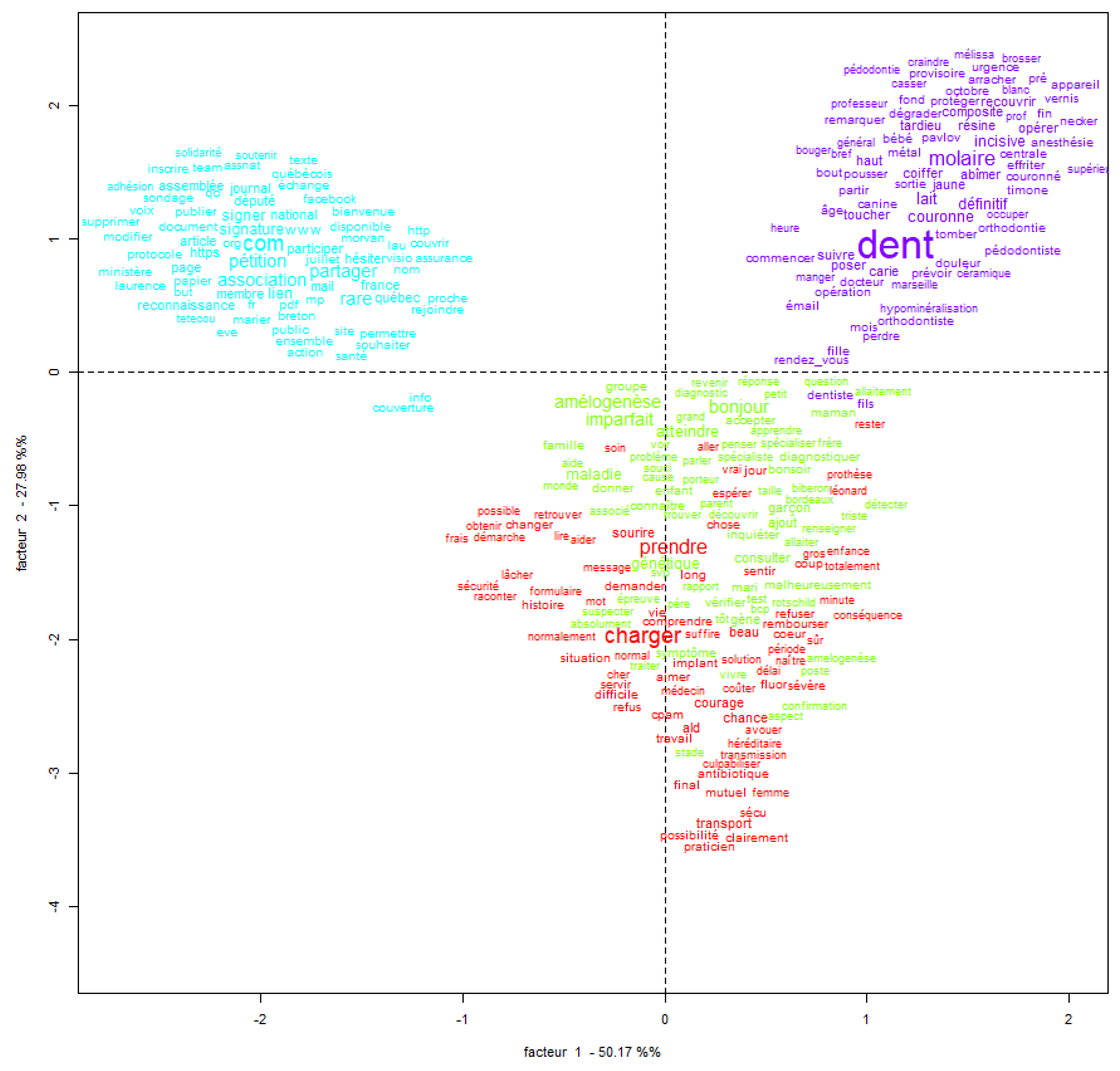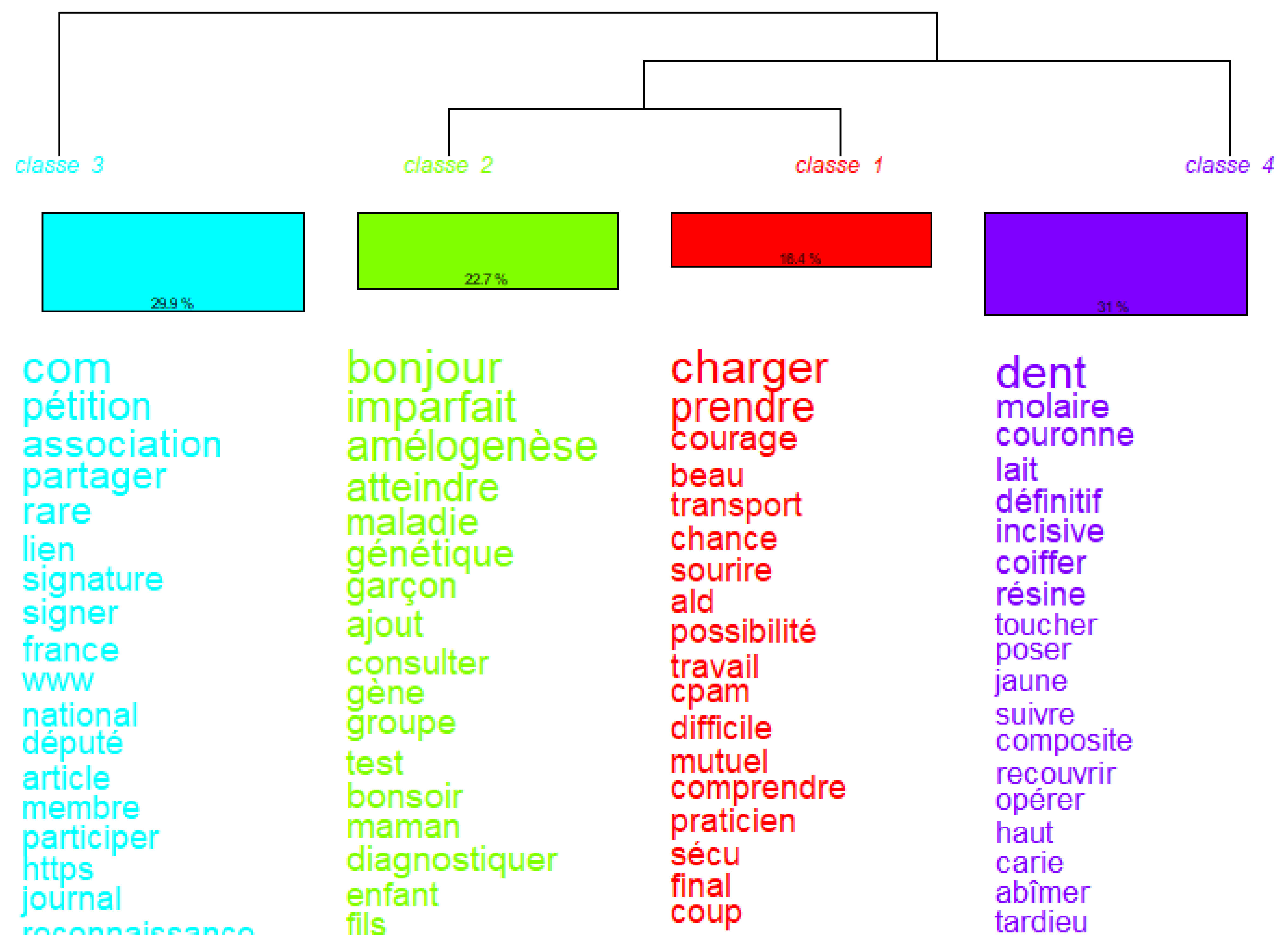 - Class 2 (in green): Genetic and Clinical Nature of the Disease (19%), with the following top words: “génétique”, “maladie”, “imparfaite”, “gène”, “enfant”, “atteindre”, “test”, “amélogenèse”, “transmettre”. This class reflects a biomedical perspective of the condition. It includes genetic terms and refers to the transmission, testing, and emotional impact of amelogenesis imperfecta. Words like “chance”, “vivre”, “courage” suggest some existential or emotional framing of the diagnosis. We propose to label this class “Genetic disease framing and family impact”.