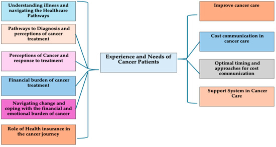 Table 1 presents the demographic characteristics and distribution of cancer types among the study participants. The variables include age, gender, religion, marital status, literacy, occupation, and residence. The study included nearly equal participants from different age groups, with a majority of male patients who identified as Christian, reflecting the demographics of this Christian-majority state. Most participants (approximately 90%) had an education level up to secondary school and resided in rural areas. Occupations varied, with almost half engaged in daily wage work. More than half were diagnosed with gastrointestinal cancers, followed by head and neck cancers. The results are presented under ten themes that reflect the experiences and needs of cancer patients, as shown in Figure 1.