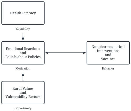 Perhaps using a program similar to the Tailoring Immunization Program, which considers various cultural and idiosyncratic differences, can address some of the barriers to adherence to public health interventions. Acknowledging and exploring the rural motivation, emotions/beliefs, and opportunities may be beneficial in understanding engagement in both nonpharmaceutical interventions and pharmaceutical preventative health behavior. See Figure 2 for a conceptual model that may be useful to understand how to influence behavior change for rural individuals.