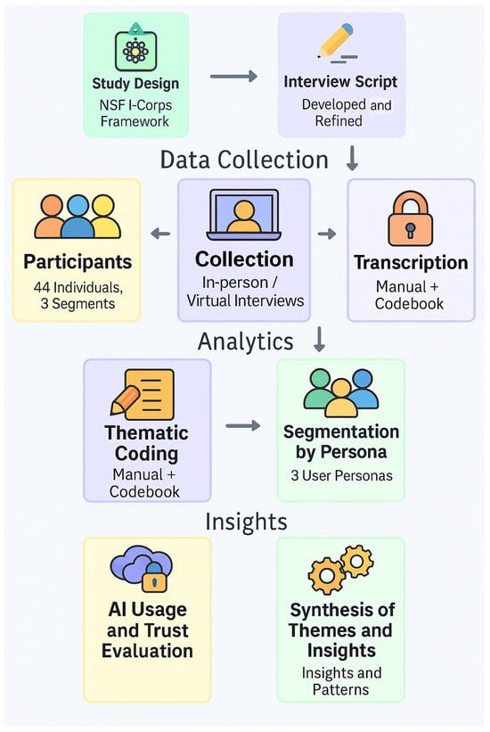 An overview of the methodological workflow, including study design, data collection, thematic analysis, and insight synthesis, is illustrated in Figure 1. The process began with study design using the NSF I-Corps framework, followed by development and refinement of the interview script. In the data collection phase, 44 participants across three segments were recruited and engaged through in-person or virtual interviews, which were manually transcribed and organized using a codebook. In the analytics phase, transcripts underwent thematic coding and segmentation by persona, resulting in the identification of three distinct user personas. Finally, in the insights phase, findings were synthesized into themes and patterns, including evaluation of AI usage and trust. Arrows indicate the sequential order of steps across design, data collection, analysis, and synthesis.