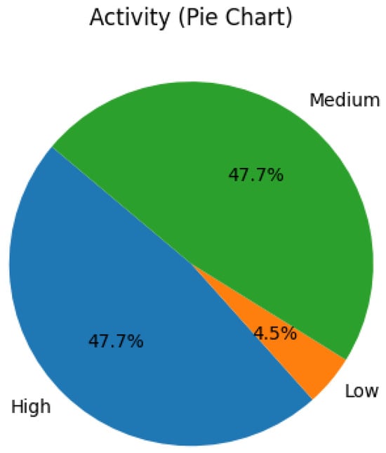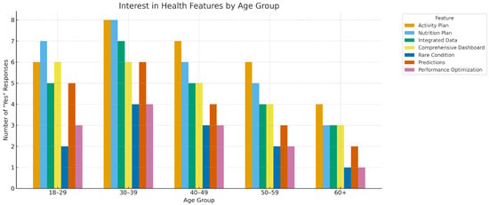 Figure 2 illustrates the distribution of self-reported physical activity levels across age groups. Participants were categorized into high, medium, and low activity levels based on their engagement with daily movement, exercise routines, and wearable-recorded metrics. Notably, 50% or more of individuals in the 20–29, 50–59, and 60–69 age brackets reported high activity levels, aligning with existing literature that associates younger and middle-aged adults with proactive health behaviors [9].